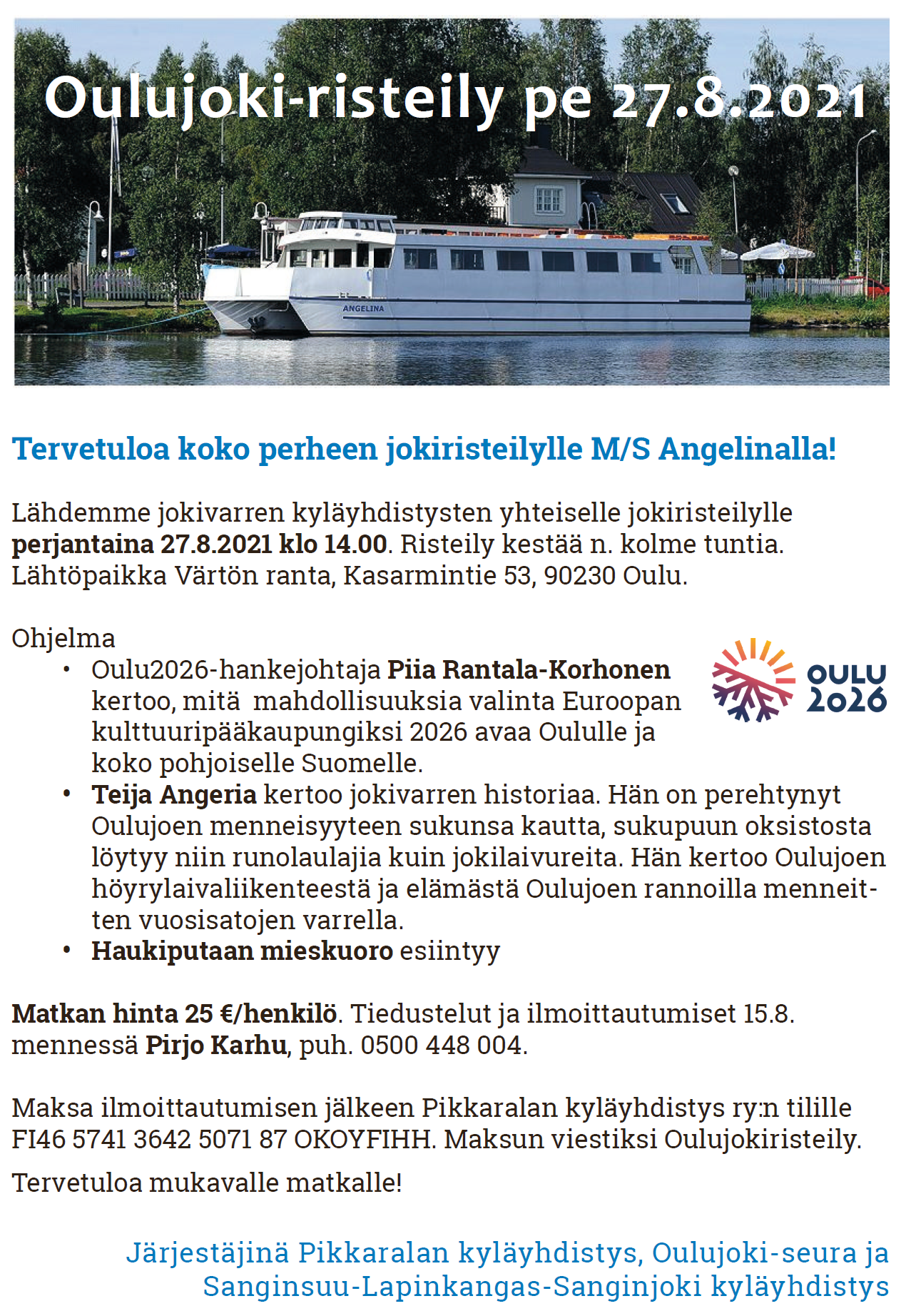 Joudumme valitettavasti ilmoittamaan, että Oulujoki-risteily joudutaan perumaan korona-rajoitusten vuoksi.