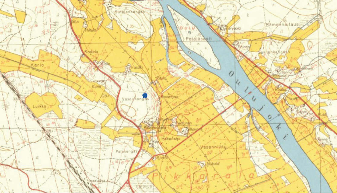 Oulujokivarren osayleiskaavan tarkistus: AT-c/ kyläkeskusalue. Alue on varattu kyläkeskukseksi. Pikkaralan koulua käyneet tunnistavat paikan koululiikunnan suunnistustunneilta.