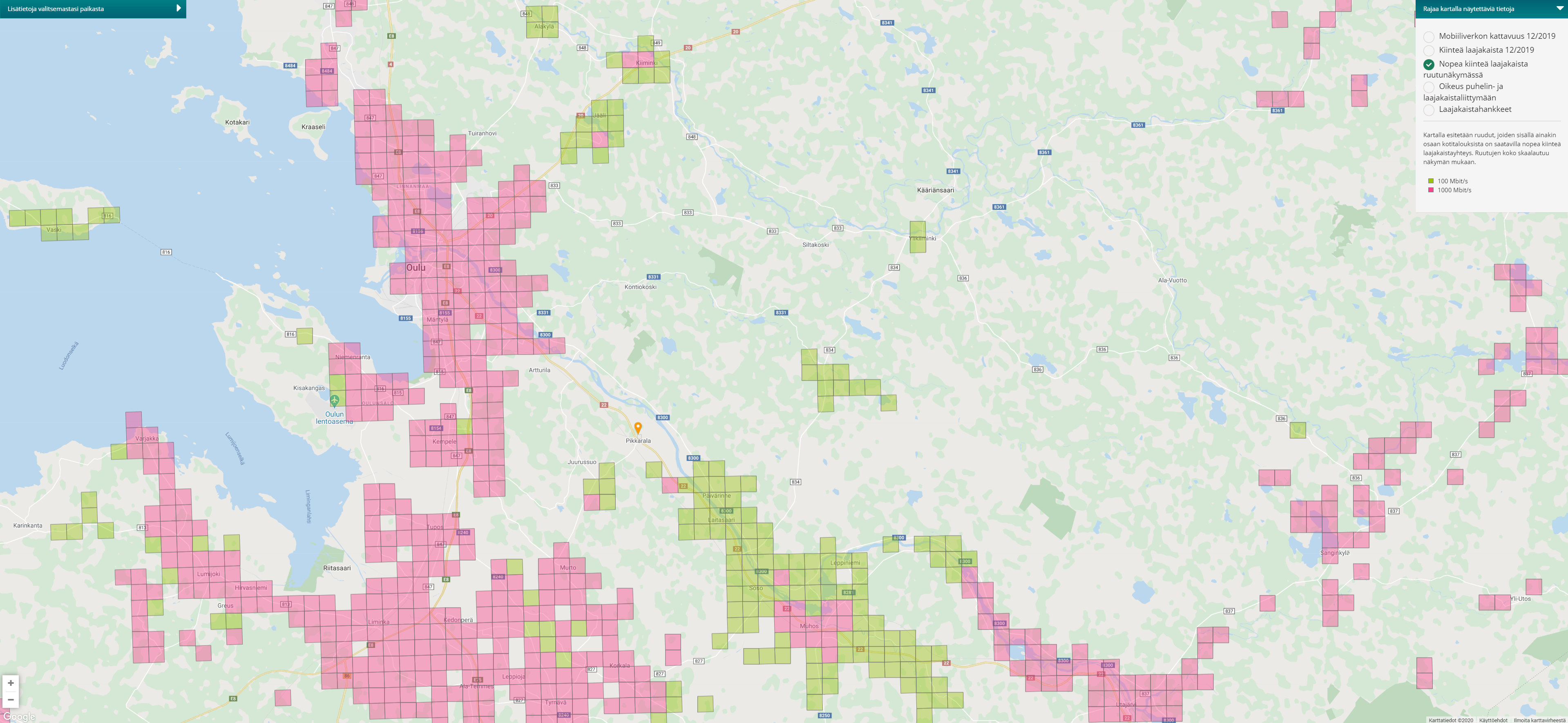 Ylläoleva karttakuva on otettu Traficomin karttapalvelusta ( https://eservices.traficom.fi/monitori/area ). Kartalla esitetään ruudut, joiden sisällä ainakin osaan kotitalouksista on saatavilla nopea kiinteä laajakaistayhteys. 100Mbit/s nopeuksiin yltävät yhteydet on merkitty vihreillä ja 1000Mbit/s punaisilla laatikoilla. Kartta kuvaa tilannetta Joulukuussa 2019. Huomattakoon, että esimerkiksi Oulun kaupungin keskusta-alueella suuri osa yhteyksistä käyttänee kaapeli-TV verkkoa. Huomattavaa on myös, että kaapeli-TV modeemien yhteysnopeuksia ei voida juurikaan enää kasvattaa nykyisestä.